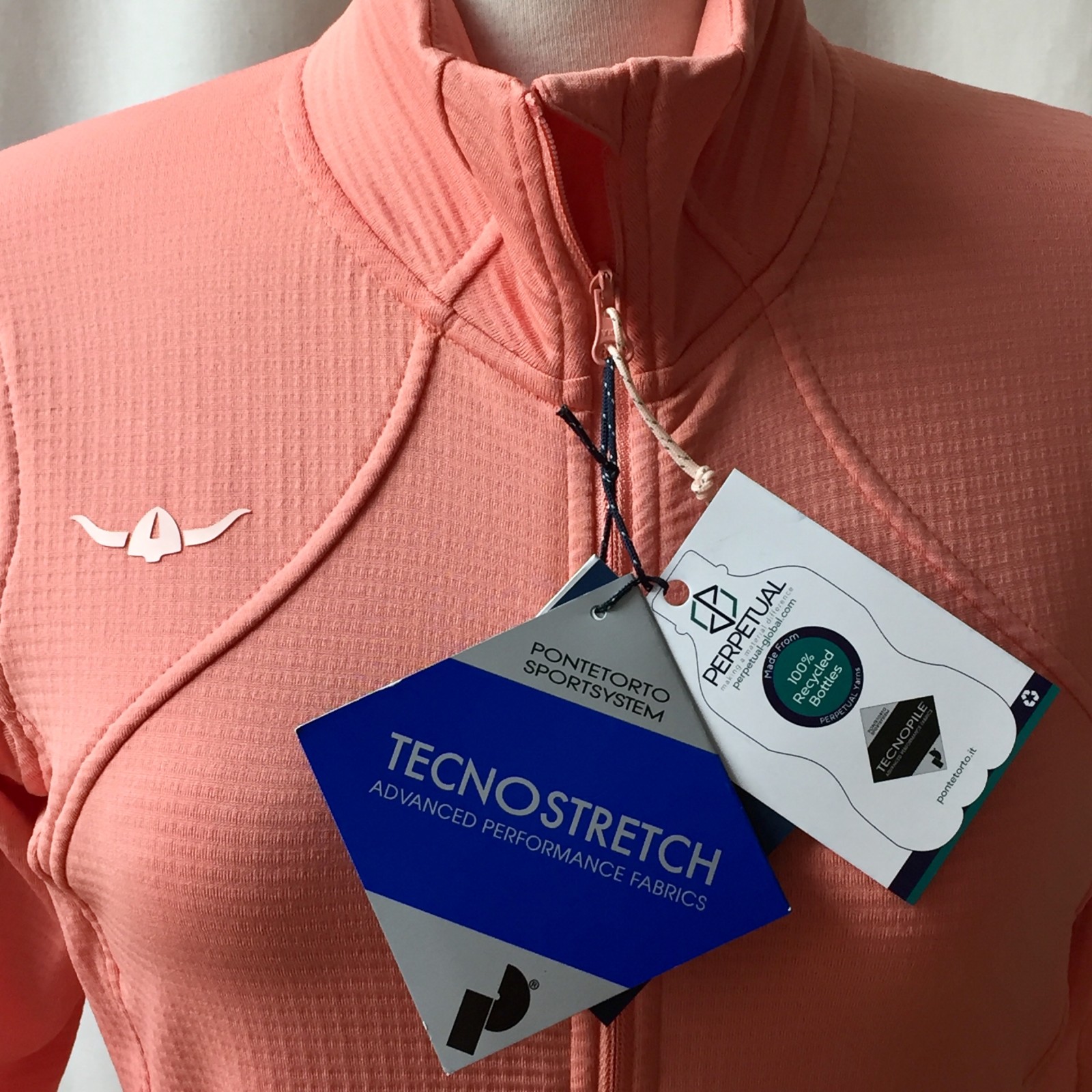 Das Kleidungsstück wurde zu 100% aus recycelten PET-Flaschen hergestellt, um genau zu sein aus 12 Flaschen pro Jacke.